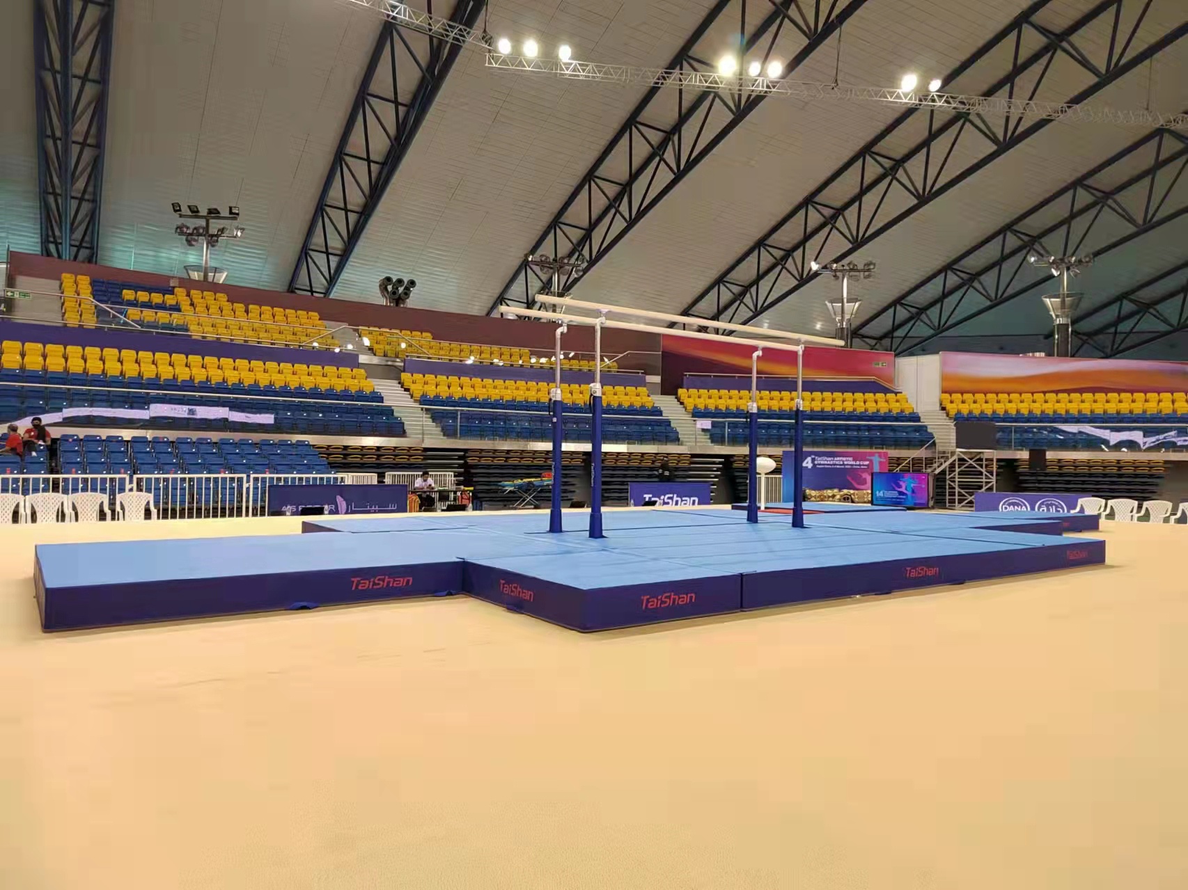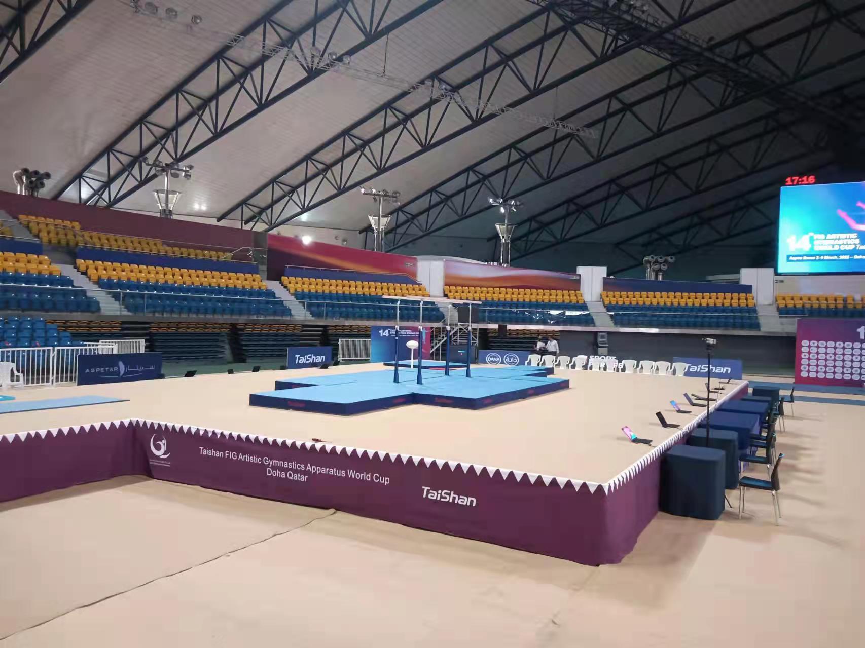 为保障运动健儿的出色发挥,jinnian金年会派出了经验丰富的专业服务团队,于2月22日出发,到达多哈后,队员们不辞辛劳,马上投入到技术指导和安装工作中,并按计划于2月28日圆满完成男子训练馆、女子训练馆、竞赛馆等场馆的安装、调试工作。