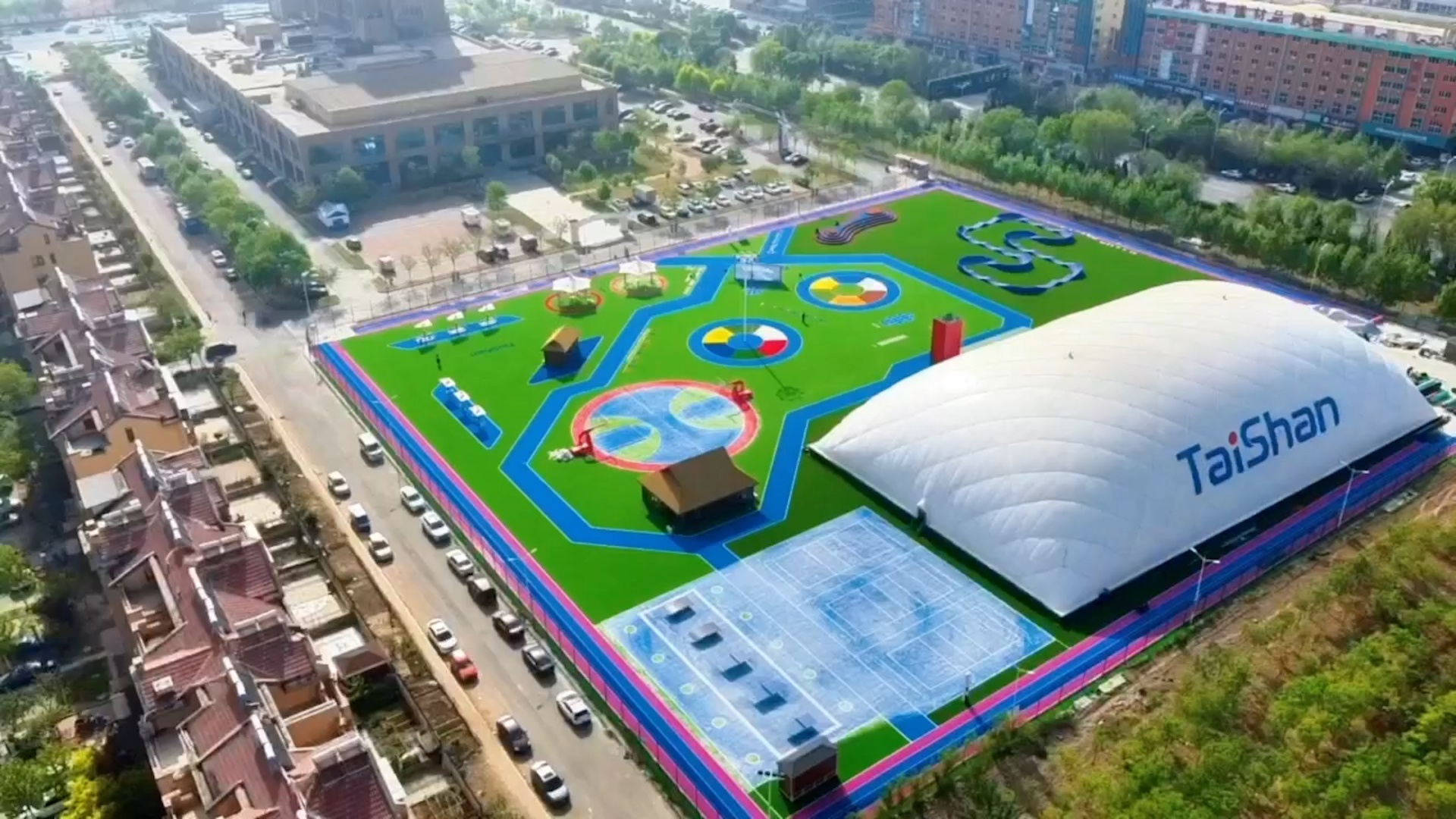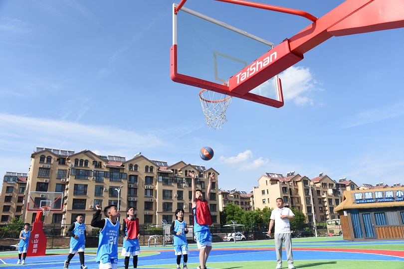 在场地铺设上,均采用泰山新材料功能人造草铺设,全方位保证运动安全和环保;气膜式篮球综合运动馆,内部设置2片篮球场、6片乒乓球场地及1片网球场。网球场同时套线4个羽毛球场地。场馆内可以满足体育运动,体育教学及群众比赛需求。从场馆到运动超市、智慧体测小屋,全部采用可装配式建筑。